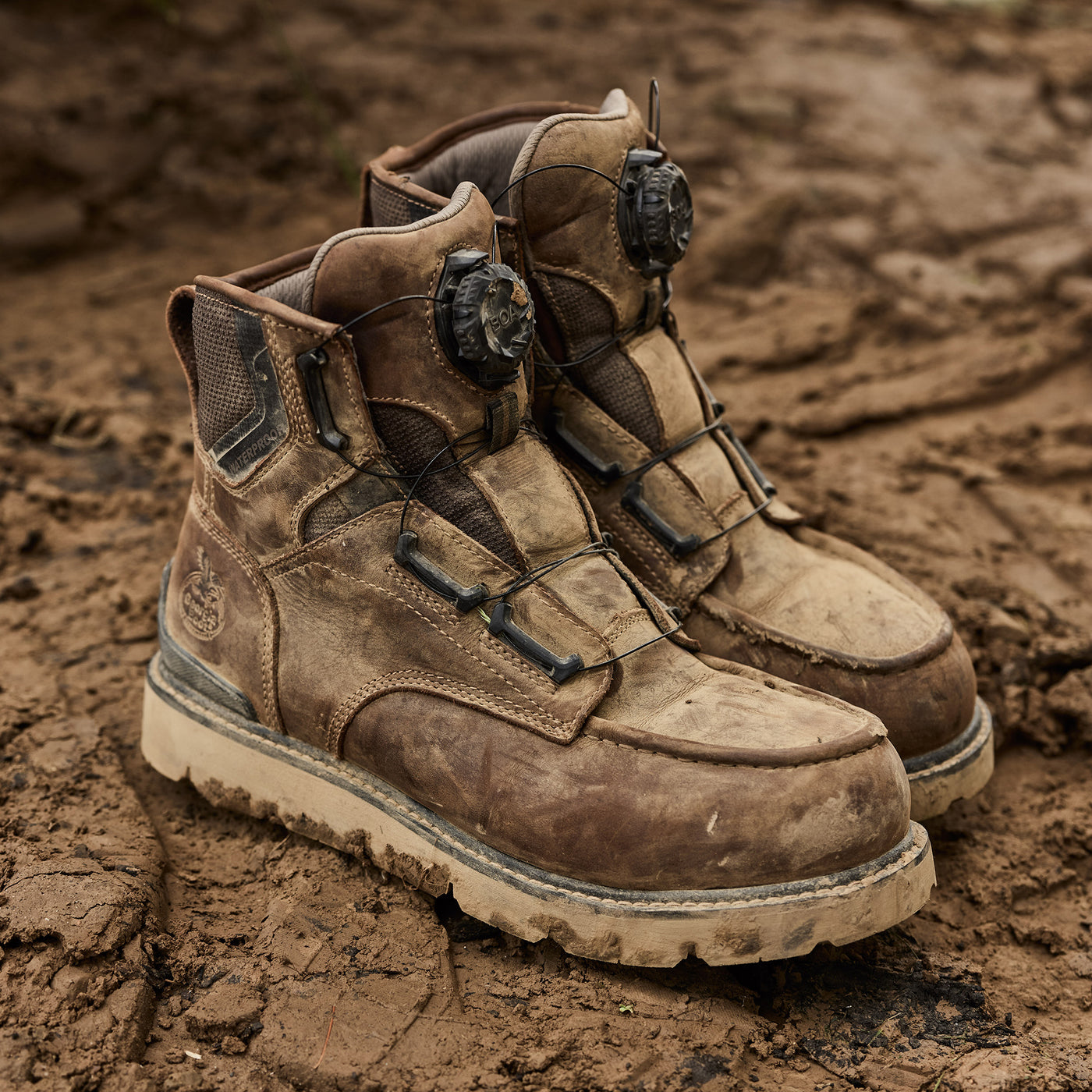 Close-up of a brown leather boot with 'Georgia Boot' label on a dark background