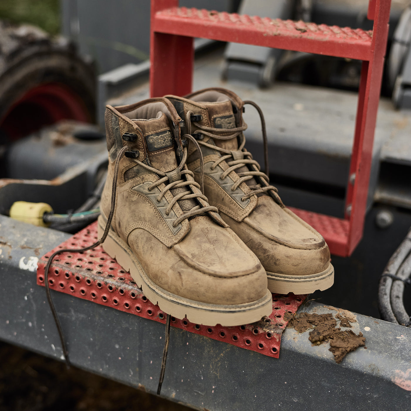 This full-grain leather boot features bond welt construction, our Georgia Waterproof System, and a high-performance mesh lining for breathability, and combination eyelet/hook hardware reinforced with a TPU eyestay. A Stretch Gusset makes it easy to pull on while ensuring a secure fit.
